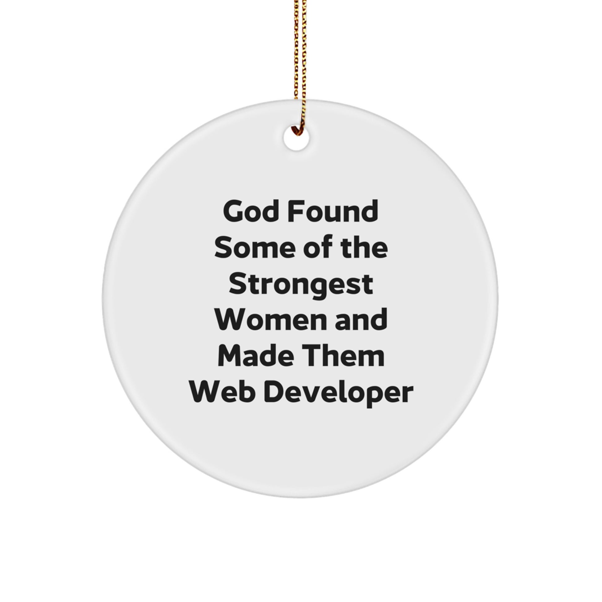 Are you looking for a unique and funny gift for the web developer in your life? Look no further! Our 'God Found Some Of The Strongest Women And Made Them Web Developer' Circle Ornament is a thoughtful and humorous way to show your appreciation for their hard work and dedication. Crafted from sturdy MDF with a high-gloss plastic finish, this ornament is lightweight, resistant to breaking, and vibrantly printed from edge-to-edge. Perfect for hanging on the Christmas tree or giving as a gift, this ornament is sure to bring a smile to their face. Whether you're shopping for a friend, coworker, or family member, this gift is sure to be a hit. So why wait? Don't miss out and show your web developer that you care!