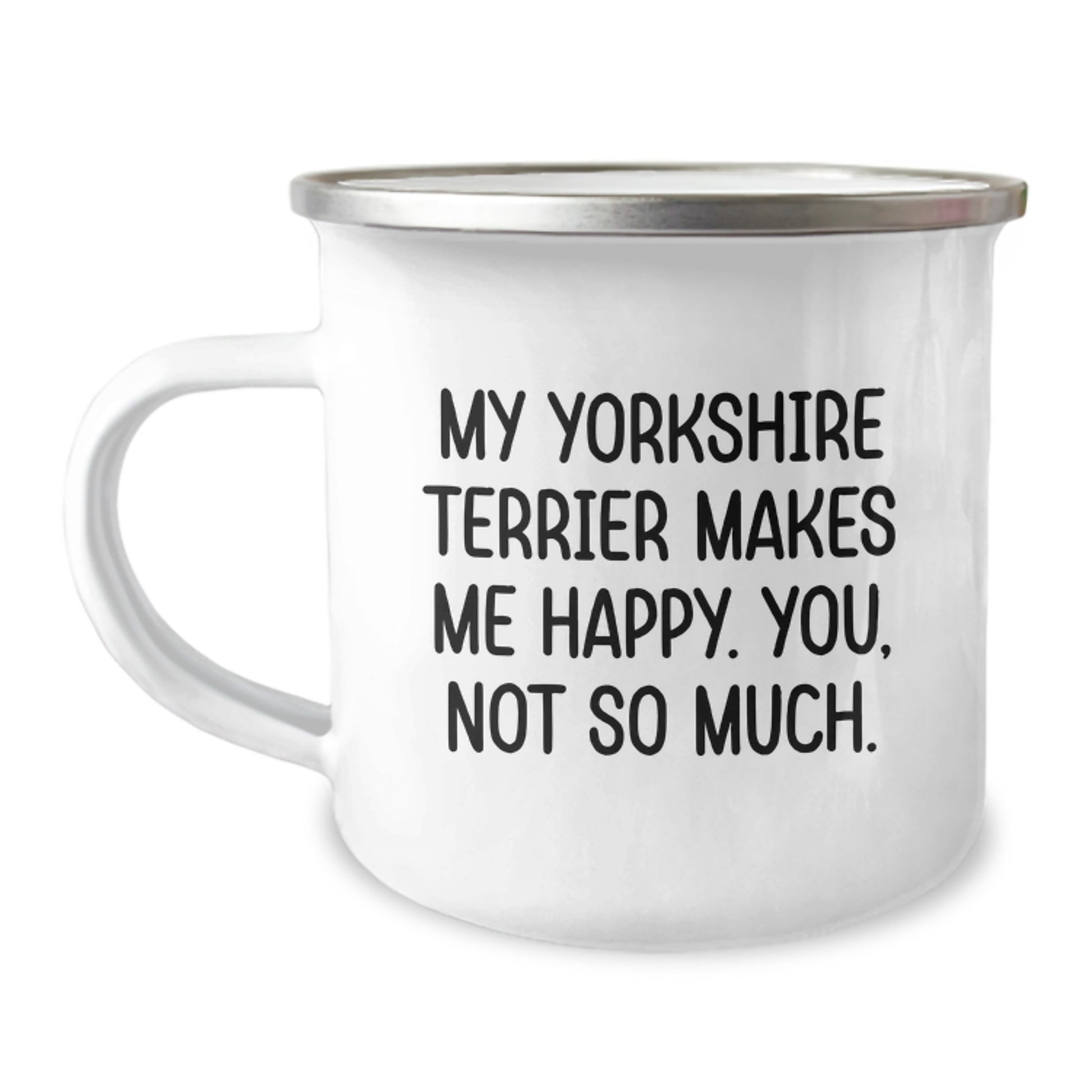 - Make every camping trip with your Yorkshire Terrier Dog a memorable one with this 'My Yorkshire Terrier Makes Me Happy. You, Not So Much.' Camping Mug, designed specifically for dog lovers like you. The stainless steel with enamel finish ensures durability and ease of cleaning, while the 12 oz capacity is perfect for your morning coffee or tea.