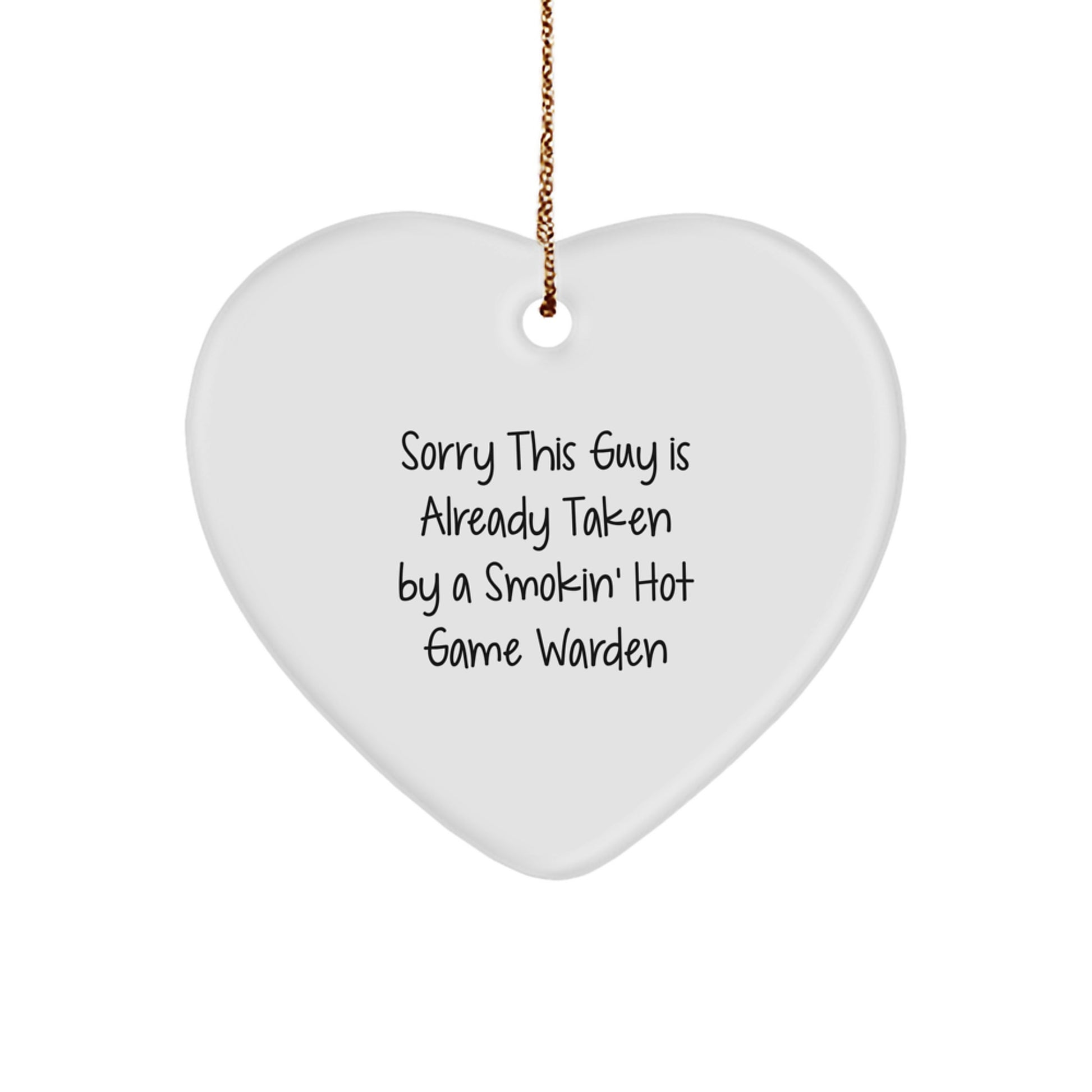 - The 'Sorry This Guy Is Already Taken By A Smokin' Hot Game Warden' quote is printed on a beautiful Heart Shaped ornament that is perfect for decorating your home or office during the Christmas season.