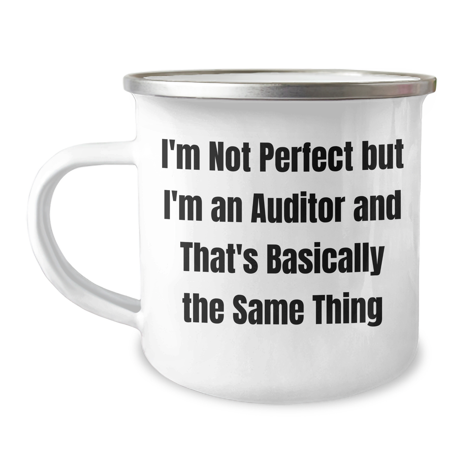 - Get the ideal gift for the Auditor in your life! This camping mug is designed with a quote that says 'I'm Not Perfect But I'm An Auditor And That's Basically The Same Thing' - a humorous take on the profession. The stainless steel material with enamel finish ensures durability and ease of cleaning, making it perfect for outdoor adventures.