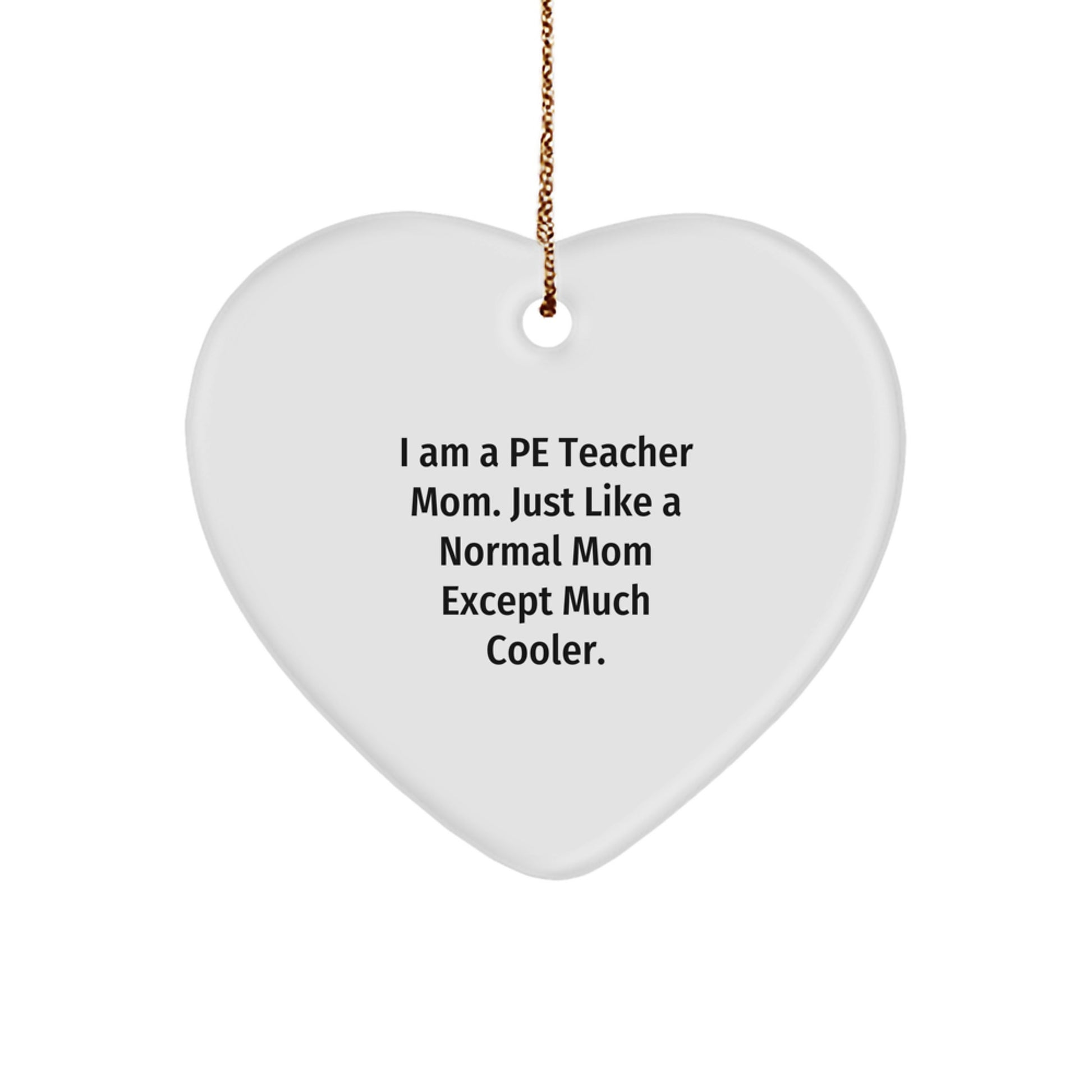 - This Heart Ornament, inspired by the quote 'I Am A PE Teacher Mom. Just Like A Normal Mom Except Much Cooler.' is a thoughtful and humorous gift for the PE Teacher in your life. Made from sturdy MDF with a high-gloss plastic finish, it's lightweight, resistant to breaking, and vibrantly printed from edge-to-edge ensuring bright, vivid colors. Ships with a festive gold cord for easy hanging, perfect for stress-free decorating.