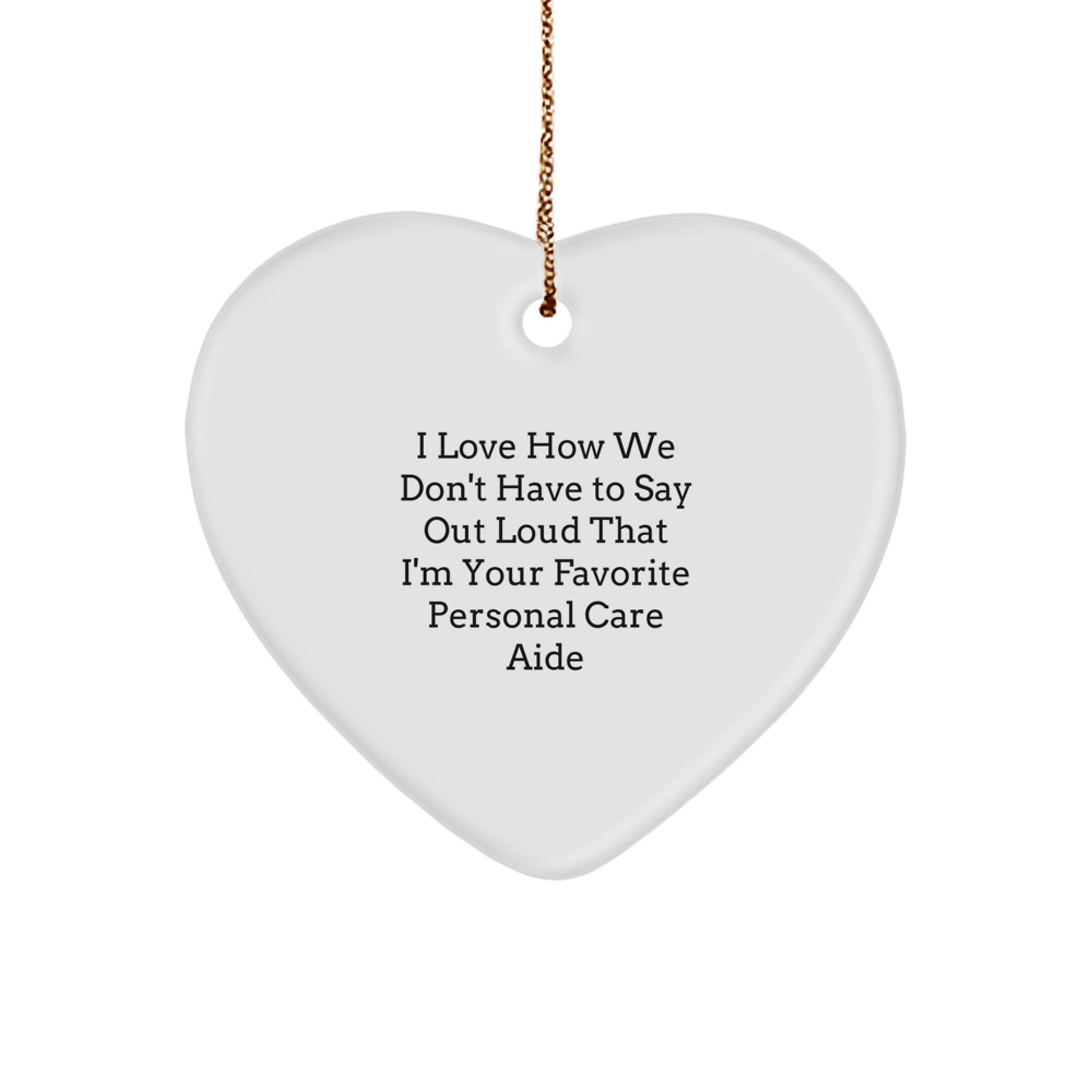 Are you looking for a thoughtful gift for your favorite Personal Care Aide? Look no further! This beautifully crafted Heart Ornament is the perfect way to show your appreciation and gratitude. With its vibrant colors and heartwarming message, it's sure to bring a smile to their face. Whether you're a family member, friend, or coworker, this gift is sure to be cherished. The quote, 'I Love How We Don't Have To Say Out Loud That I'm Your Favorite Personal Care Aide,' is a heartfelt expression of your feelings and will be cherished for years to come.