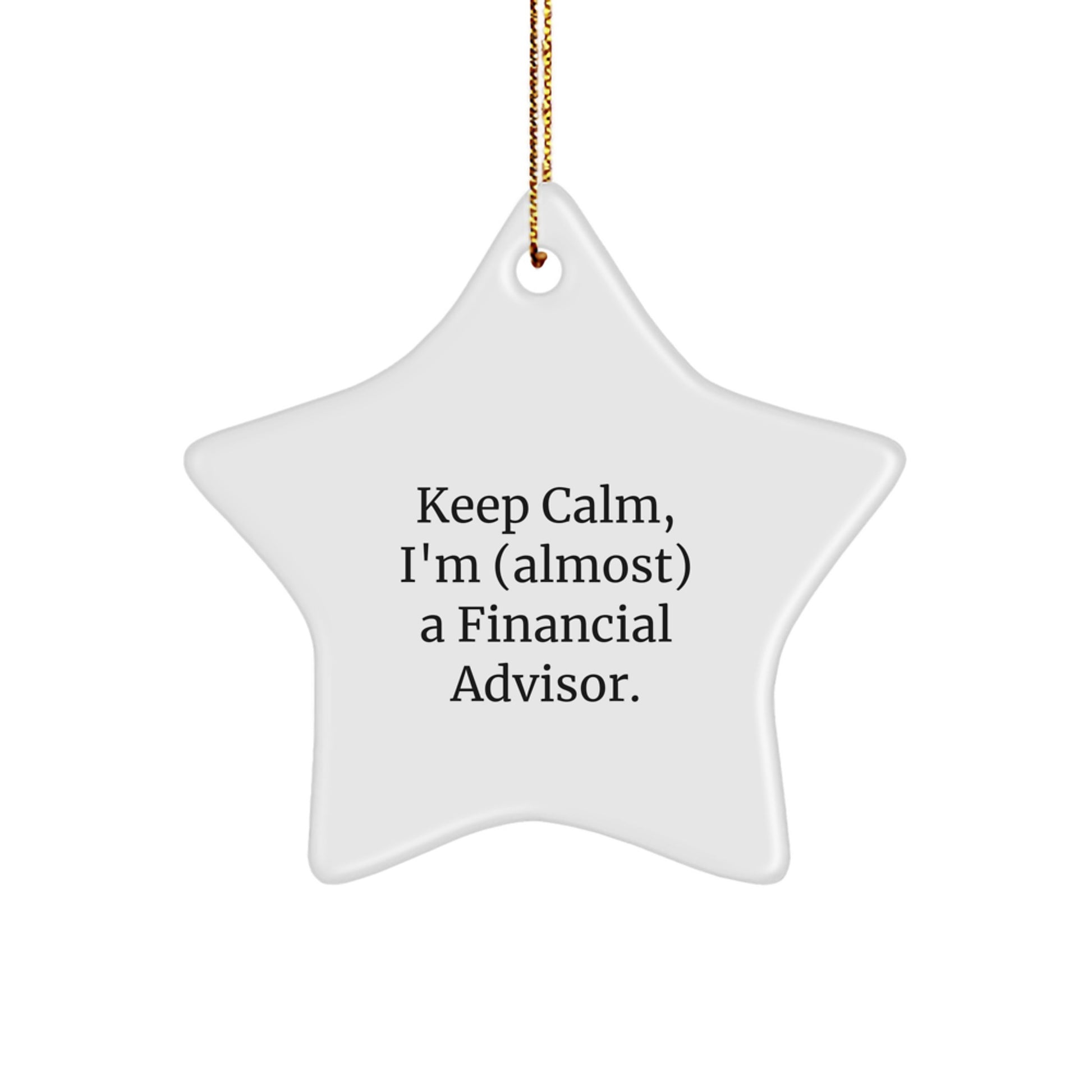 - This Keep Calm I'm almost A Financial Advisor. Star Ornament is a thoughtful gift for a fellow Financial Advisor or a unique addition to your office decor. The vibrant star design is printed from edge-to-edge using sublimation, ensuring bright and vivid colors. This ornament is crafted from sturdy MDF with a high-gloss plastic finish, making it long-lasting and resistant to breaking. Perfect for stress-free decorating, the ornament ships with a festive gold cord for easy hanging.