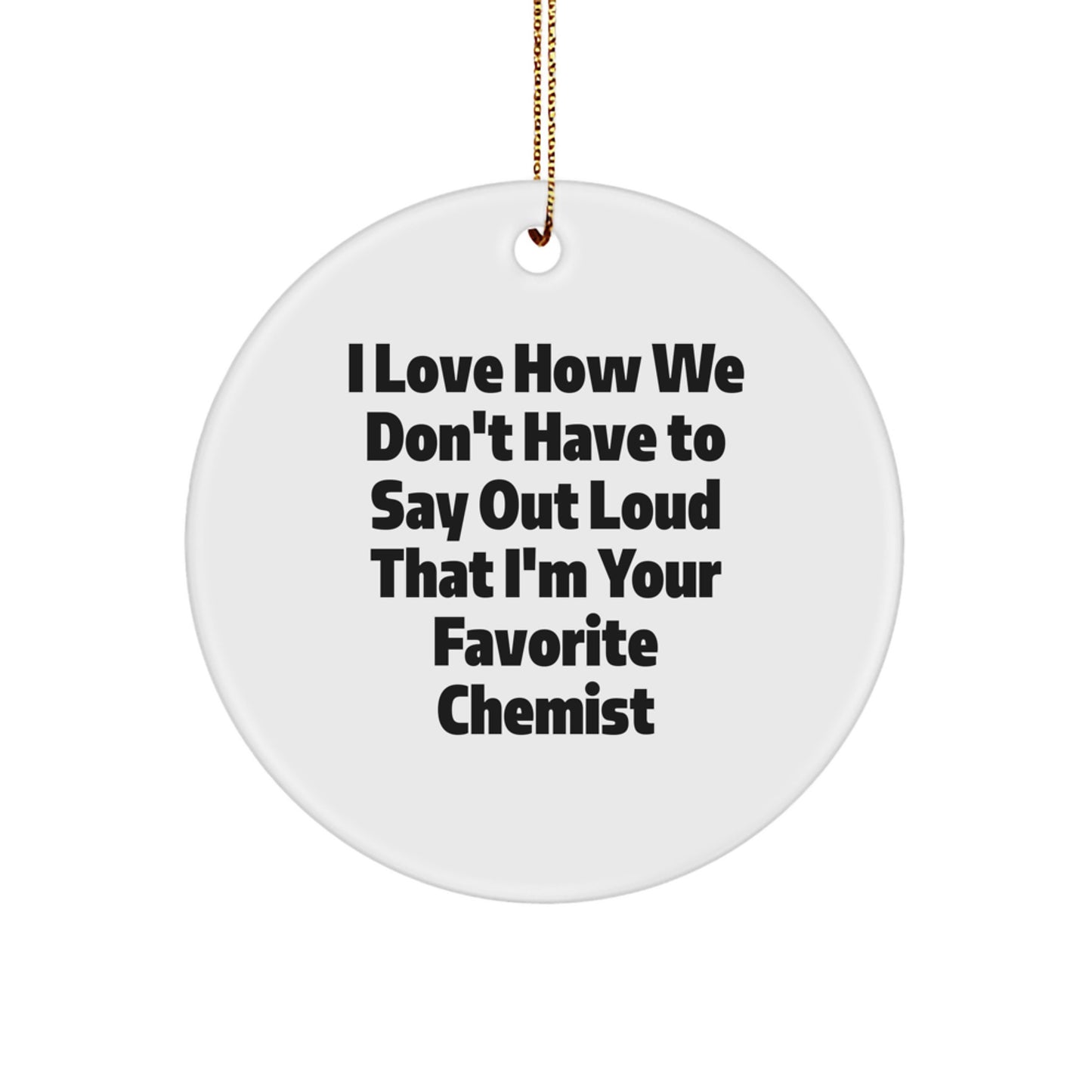 Do you know a chemist who deserves a special gift this Christmas? Look no further! This thoughtful Circle Ornament is the perfect way to show your appreciation for their hard work and dedication. The quote 'I Love How We Don't Have to Say Out Loud That I'm Your Favorite Chemist' is a humorous and relatable reminder of the special bond between a chemist and their loved ones.