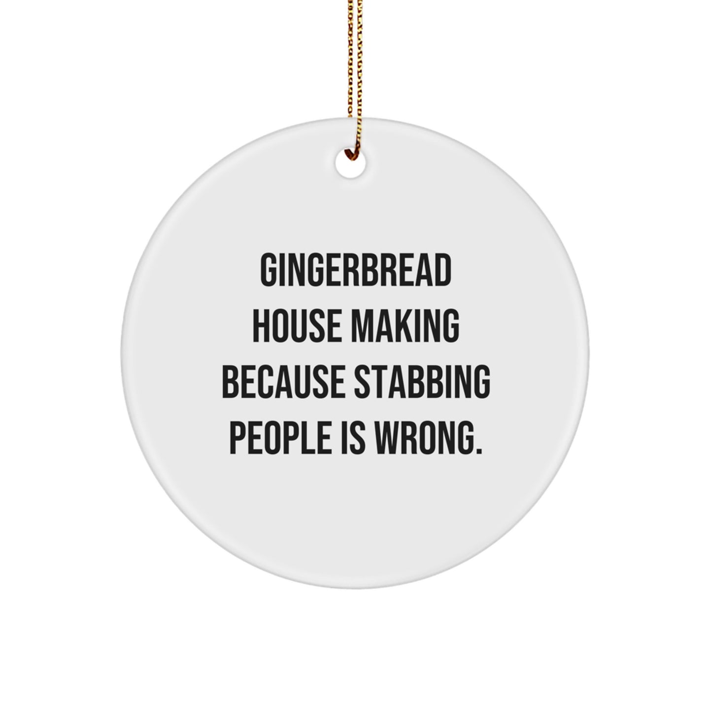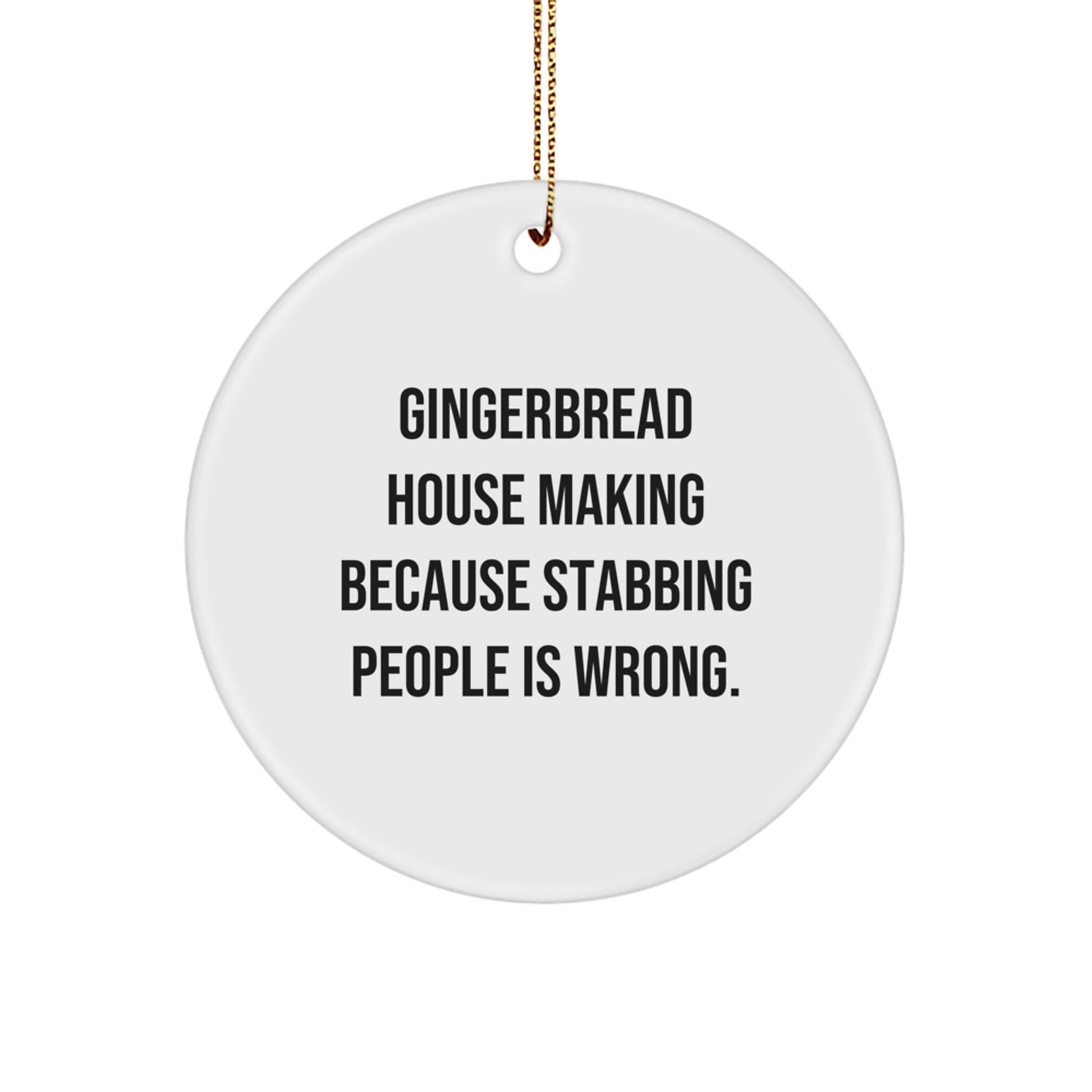 - Add a touch of humor to your Gingerbread House Making display with this funny quote circle ornament. Made from sturdy MDF with a high-gloss plastic finish, this ornament is sure to last for many Christmases to come. The vibrant print of the quote 'Gingerbread House Making Because Stabbing People Is Wrong' will add a touch of whimsy to any room.
