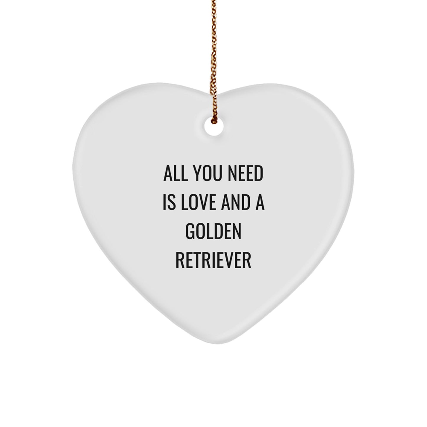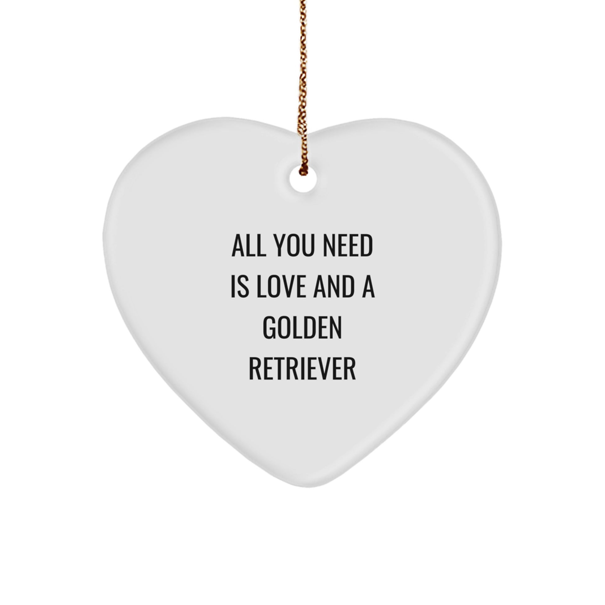 - This heart-shaped ornament is a thoughtful and meaningful way to show your love and appreciation for Golden Retriever Dogs. The quote 'All You Need Is Love And A Golden Retriever' is a perfect match for this beautiful ornament, which is crafted from sturdy MDF with a high-gloss plastic finish. The vibrant colors are printed edge-to-edge via Sublimation, ensuring a long-lasting design.