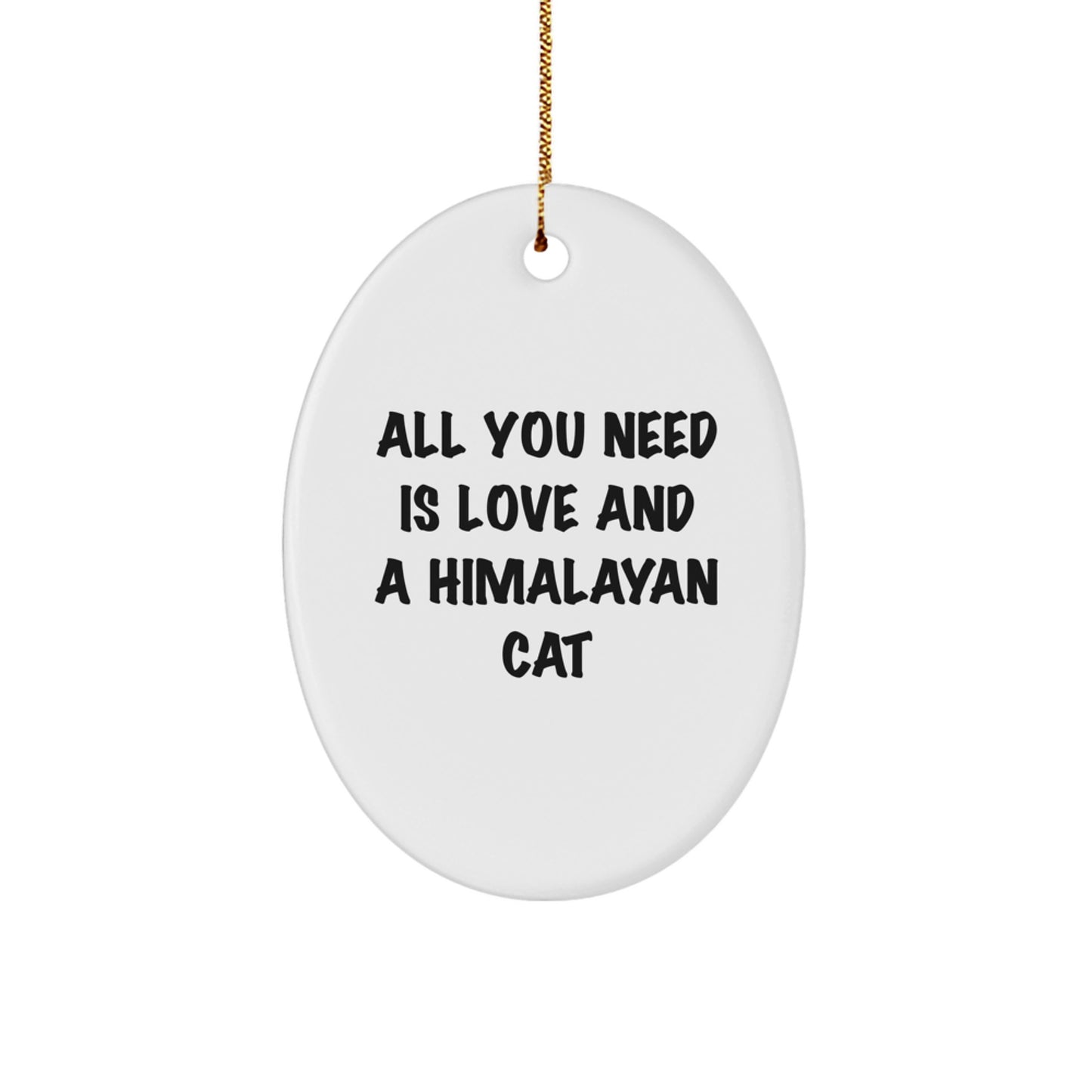 Are you a Himalayan Cat enthusiast looking for a unique gift for Christmas? Look no further! This beautiful Oval Ornament is the perfect way to show your love for those adorable, playful, and cuddly Himalayan Cats. Crafted from sturdy MDF with a high-gloss plastic finish, this ornament is lightweight, resistant to breaking, and vibrantly printed with the inspiring quote 'All You Need Is Love And A Himalayan Cat' on it. It's a thoughtful gift for any Himalayan Cat lover, whether it's a friend, family member, or coworker. So, why not spread some love and joy this Christmas with this thoughtful gift?