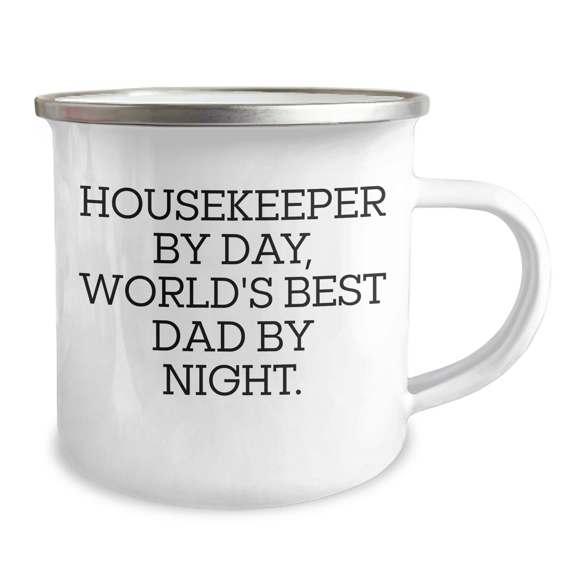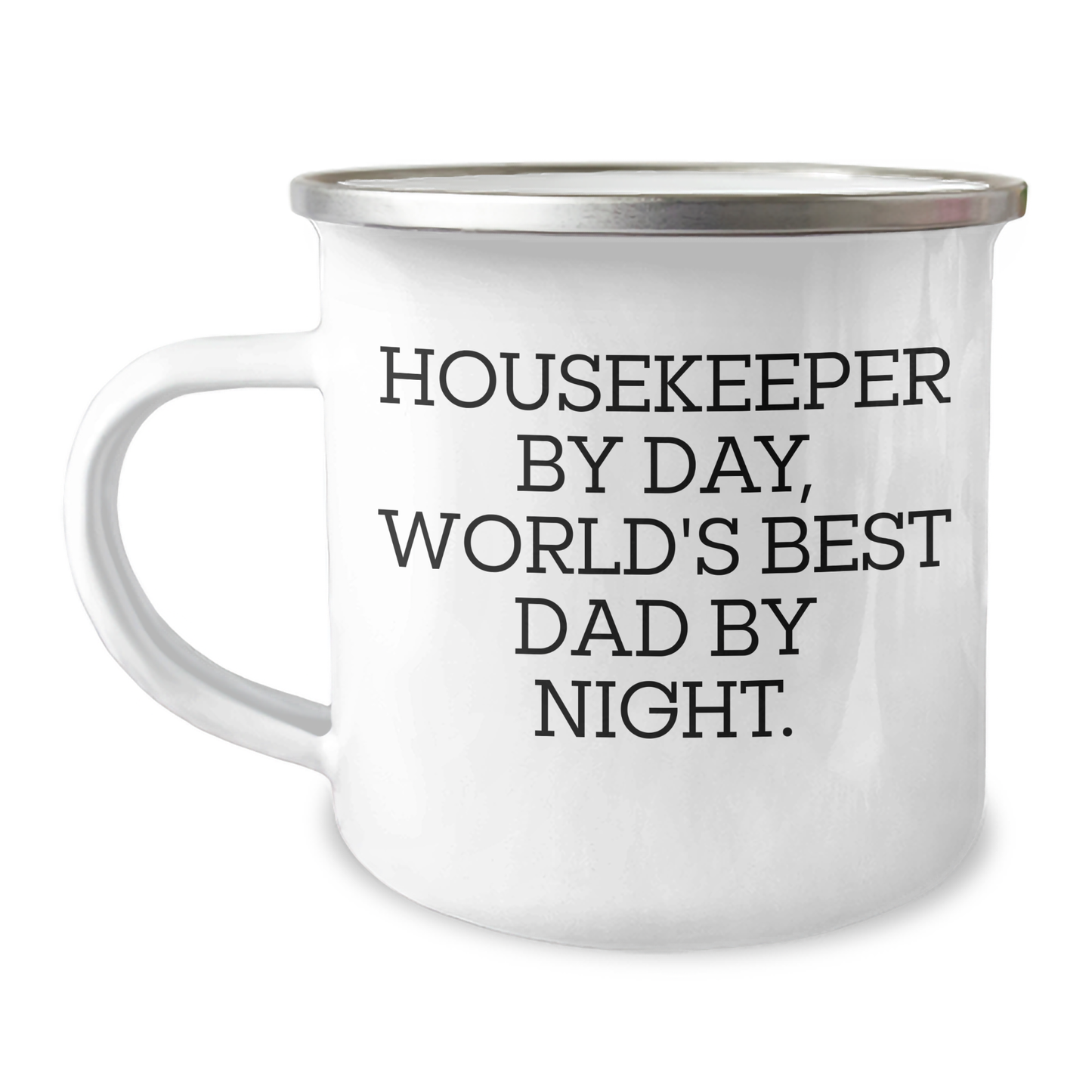 - Get ready for a camping adventure like no other with this 'Housekeeper By Day, World's Best Dad By Night.' stainless steel camping mug, designed specifically for housekeepers who love the outdoors! With a 12 oz capacity, it's the perfect size for your morning coffee or tea, and the enamel finish ensures durability and resistance to scratches.