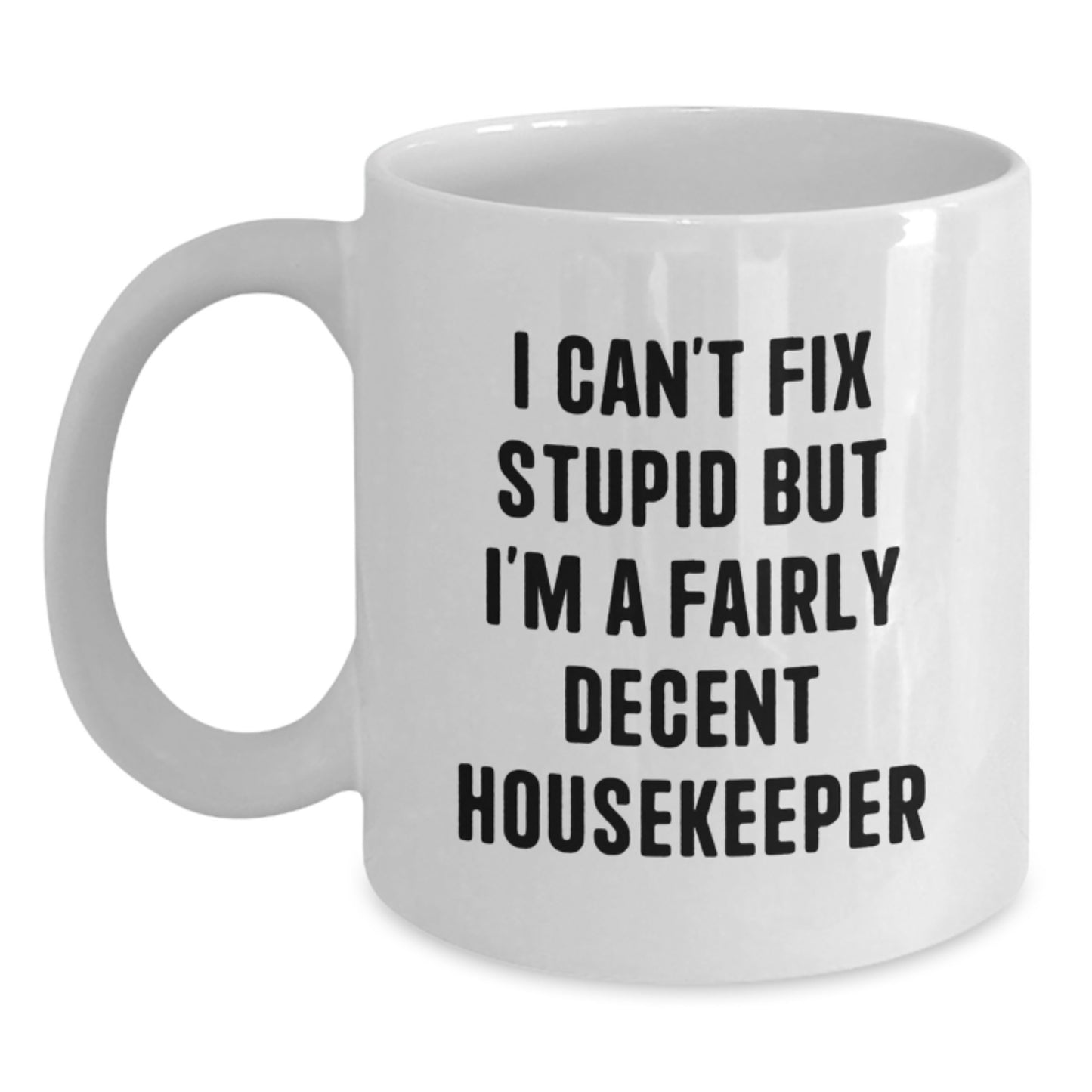 Housekeeper Humor Gifts from Friends - White Coffee Mug, Funny Quote for Birthday, I Can't Fix Stupid But I'm A Fairly Decent Housekeeper