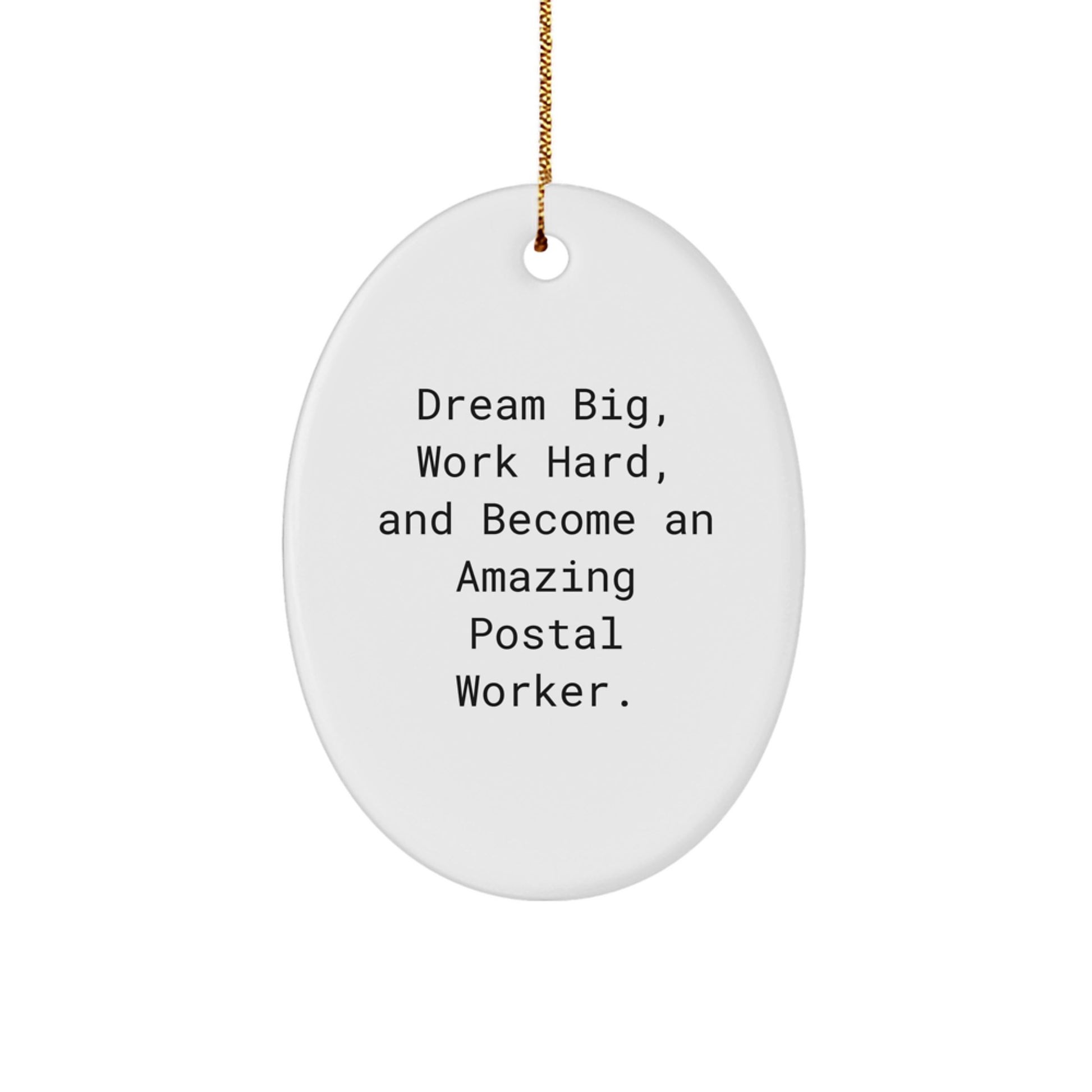 - Show your appreciation for the postal worker in your life with our inspirational Oval Ornament, featuring the quote 'Dream Big, Work Hard, And Become An Amazing Postal Worker.' This thoughtful gift is perfect for coworkers, friends, or family members who work hard every day to deliver the mail.