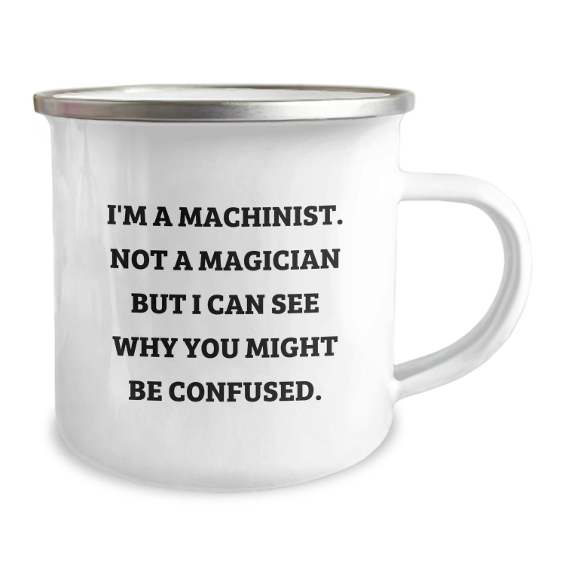 - 'I'm A Machinist. Not A Magician But I Can See Why You Might Be Confused.' - This camping mug is perfect for machinists who love the outdoors and want a unique gift for their birthday. With its 12 oz capacity, stainless steel with enamel finish, and permanent printing that won't fade after washing, this mug is both functional and stylish. Hand washing with mild detergent is recommended to maintain its durability.