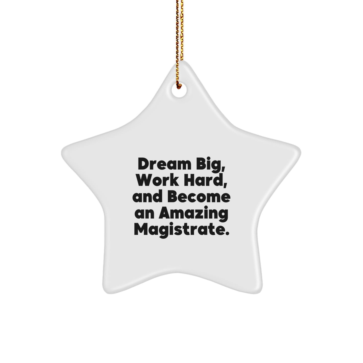 - This Magistrate Star Ornament is a great reminder to strive for greatness. The inspirational quote 'Dream Big, Work Hard, and Become An Amazing Magistrate.' is a great motivator for anyone looking to achieve their goals. Plus, it's a unique and thoughtful gift for family members, friends, or coworkers.
