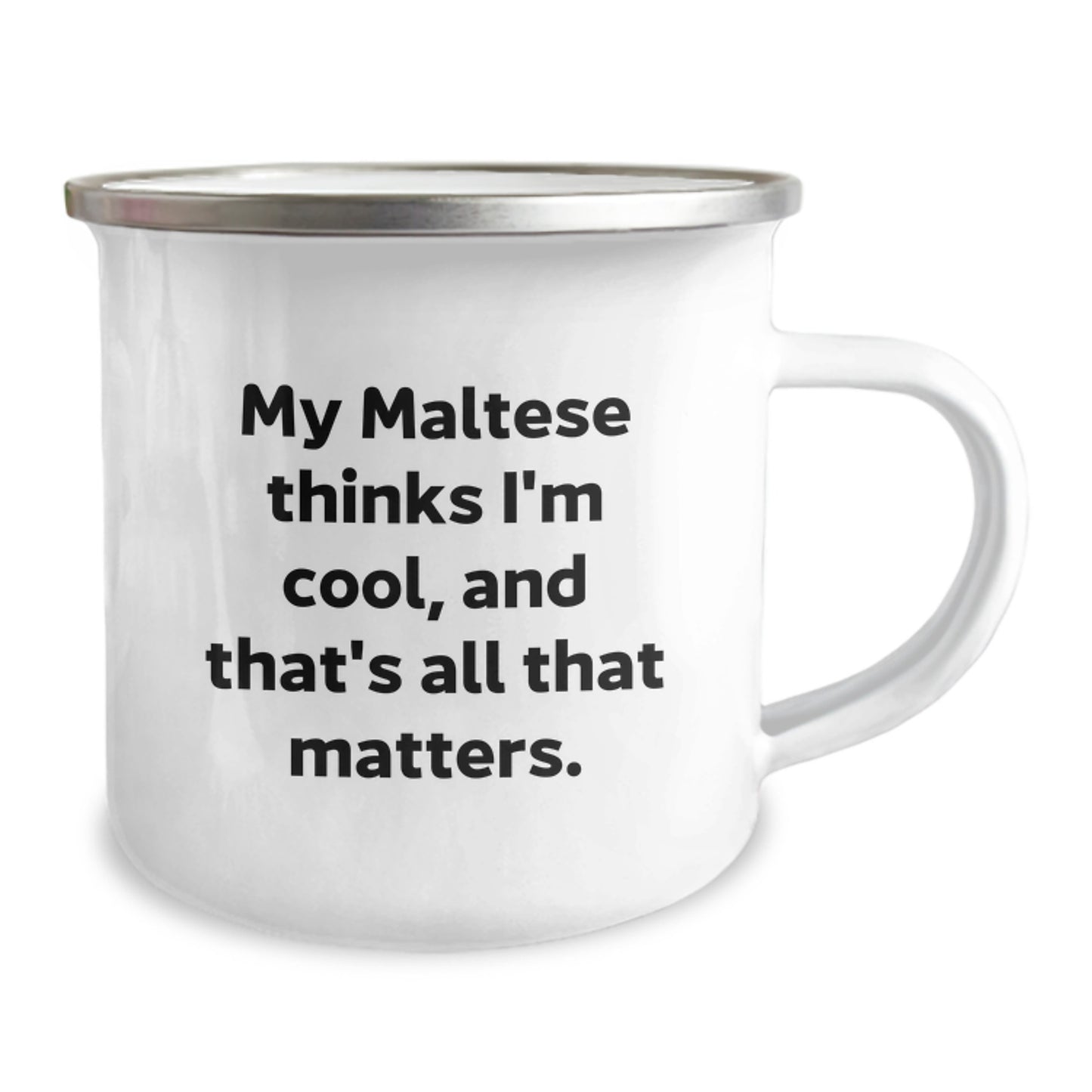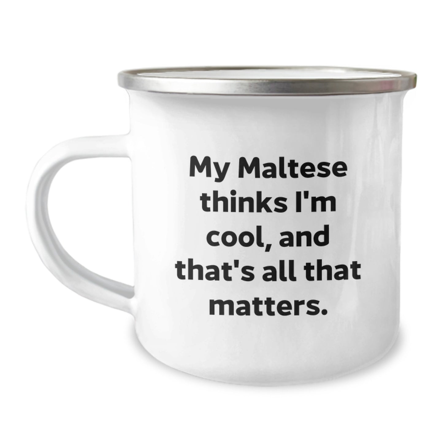 Maltese Dog Lover's Camping Mug, Funny Quote Gifts from Friends, Birthday Unique Gifts for Maltese Dog Owners, 'My Maltese Thinks I'm Cool, And That's All That Matters.'