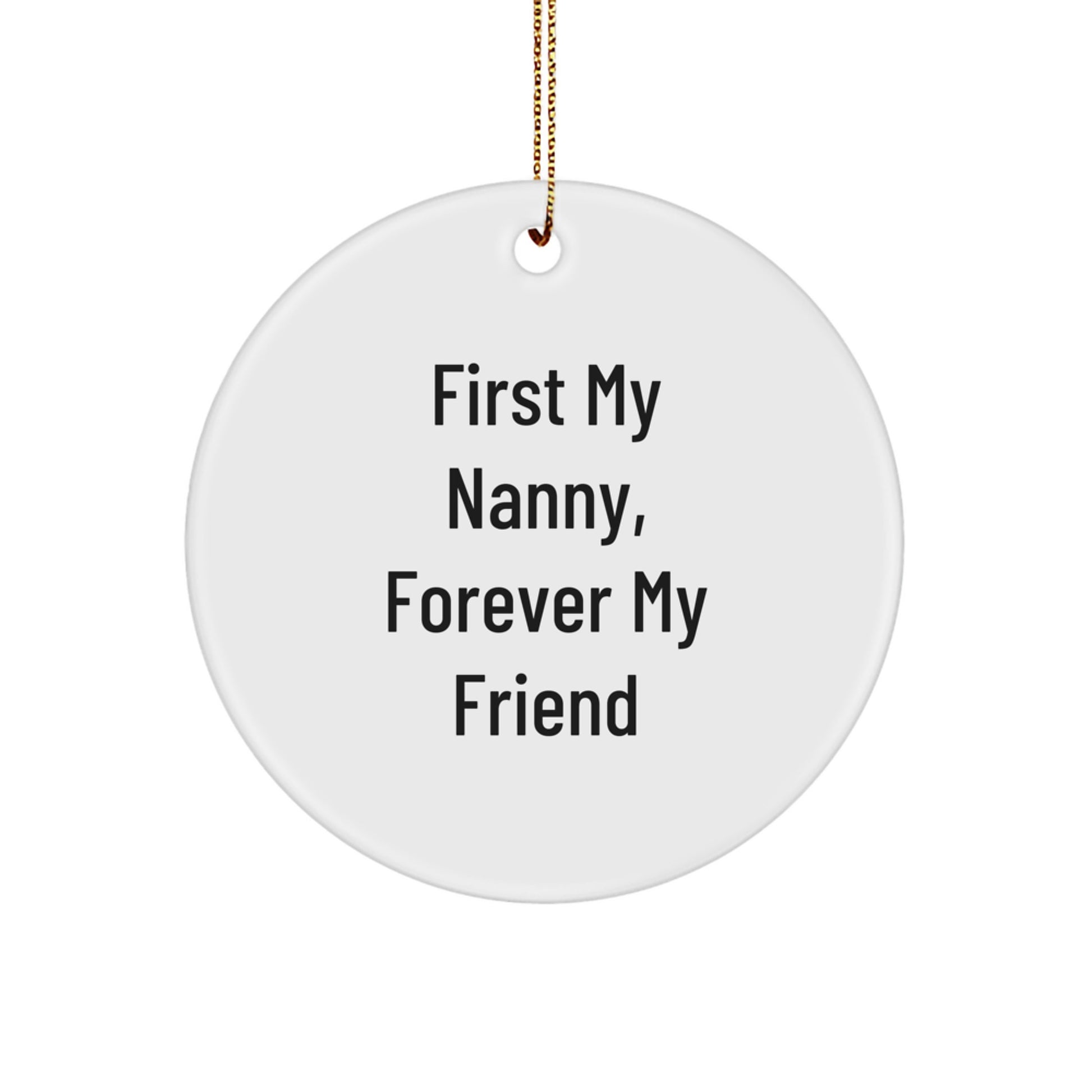 - This Circle Ornament is a thoughtful and unique gift for your nanny, showing your appreciation for all that they do. The quote 'First My Nanny, Forever My Friend' is a heartwarming reminder of the special bond between a nanny and the children in their care.