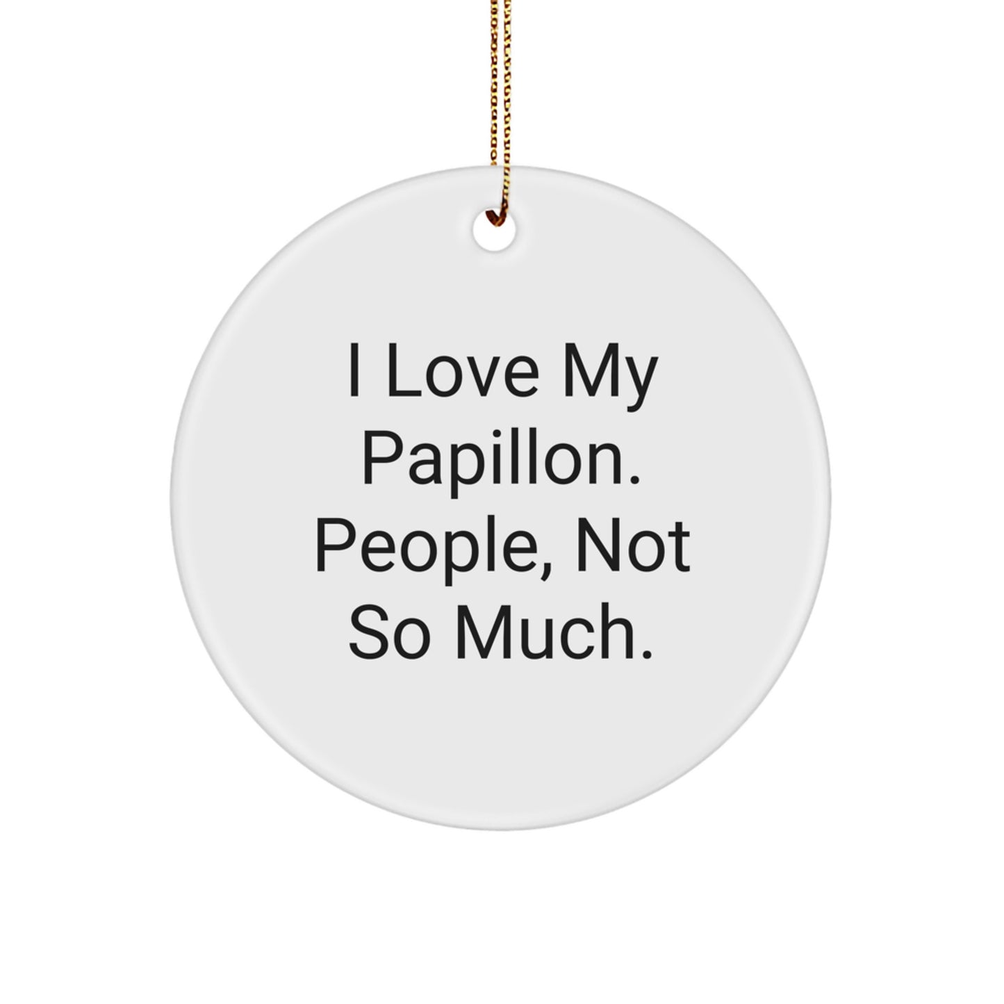 - This Circle Ornament is a unique and thoughtful gift for Papillon Dog owners and enthusiasts, featuring the hilarious quote 'I Love My Papillon. People, Not So Much.' on a sturdy MDF base with a high-gloss plastic finish.