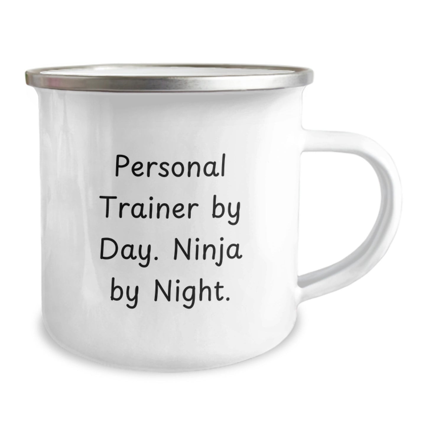 - This camping mug is perfect for Personal Trainers who love the outdoors and are passionate about fitness. The fun design reads 'Personal Trainer By Day. Ninja By Night.' in a bold, permanent print that won't fade after washing.