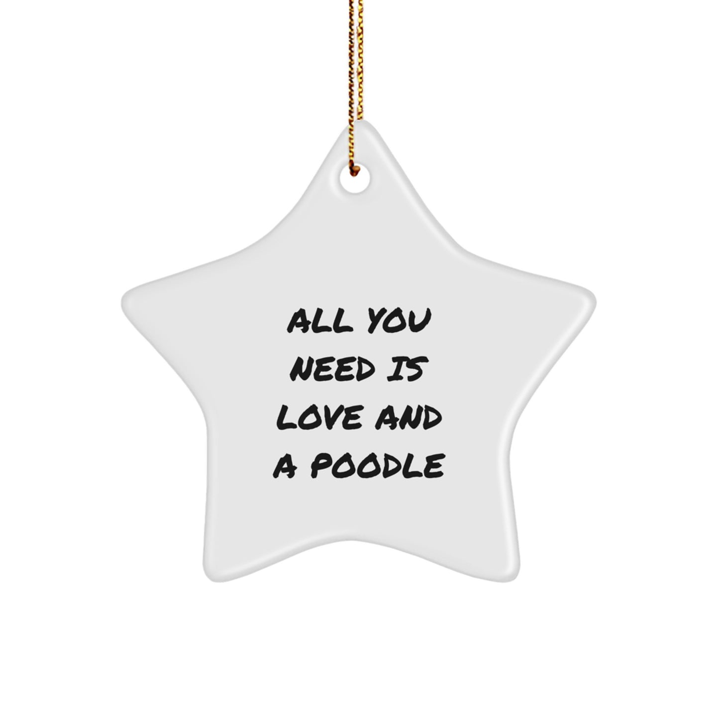 Bring a smile to the face of any Poodle Dog enthusiast with this adorable Star Ornament. As the quote says, 'All You Need Is Love And A Poodle', and this gift is sure to spread the love. Perfect for gifting to friends, family, or coworkers who adore Poodle Dogs. The vibrant design and high-gloss finish make it a beautiful addition to any Christmas tree or home decor. Whether you're a Poodle Dog owner or just a fan, this Star Ornament is the perfect way to show your love and appreciation for these lovable dogs. So go ahead, spread some joy and laughter with this thoughtful gift.