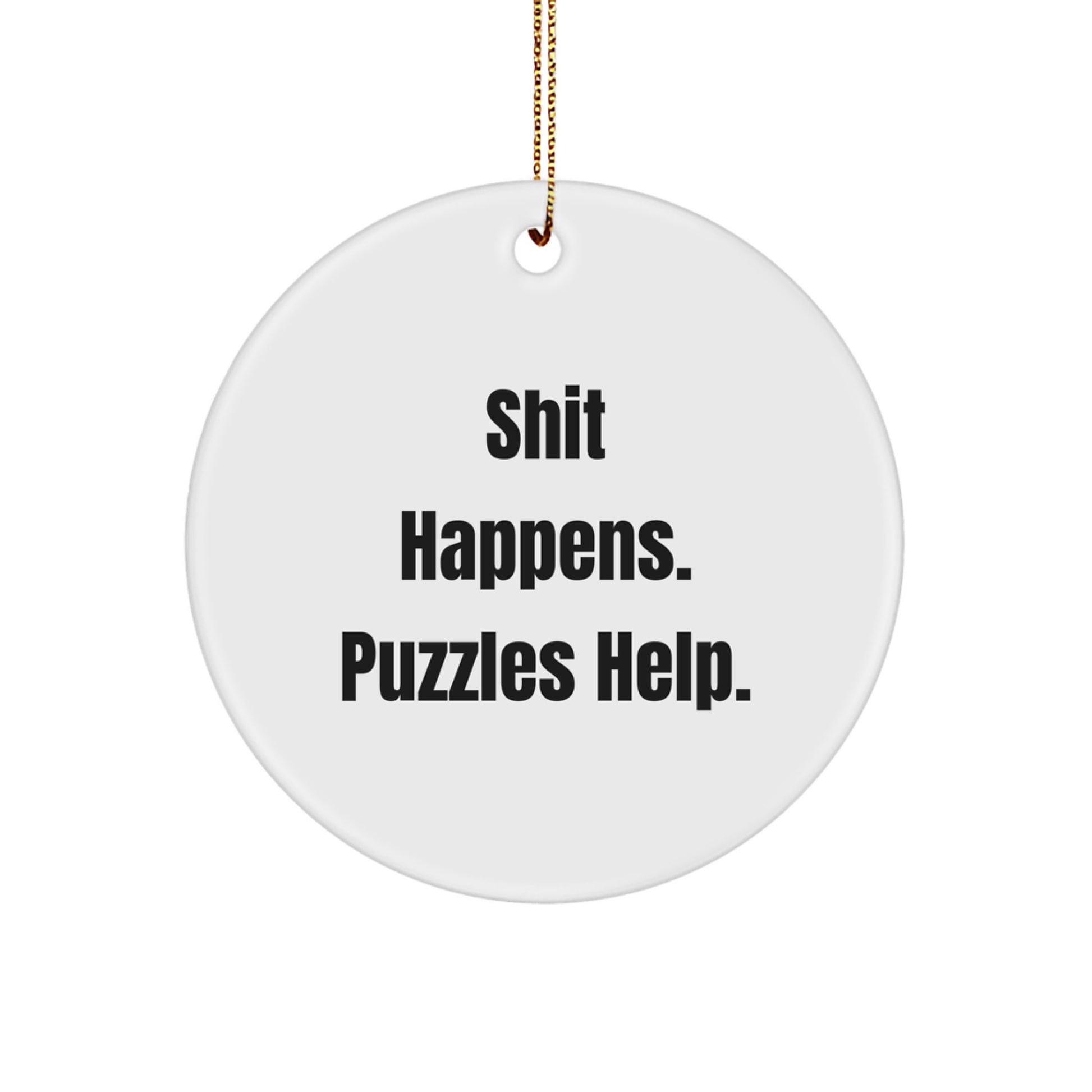 Puzzles Gifts for Friends, Family, or Coworkers - Funny Circle Ornament 'Shit Happens. Puzzles Help.' for Christmas, Handmade with Durable MDF and High-Gloss Finish