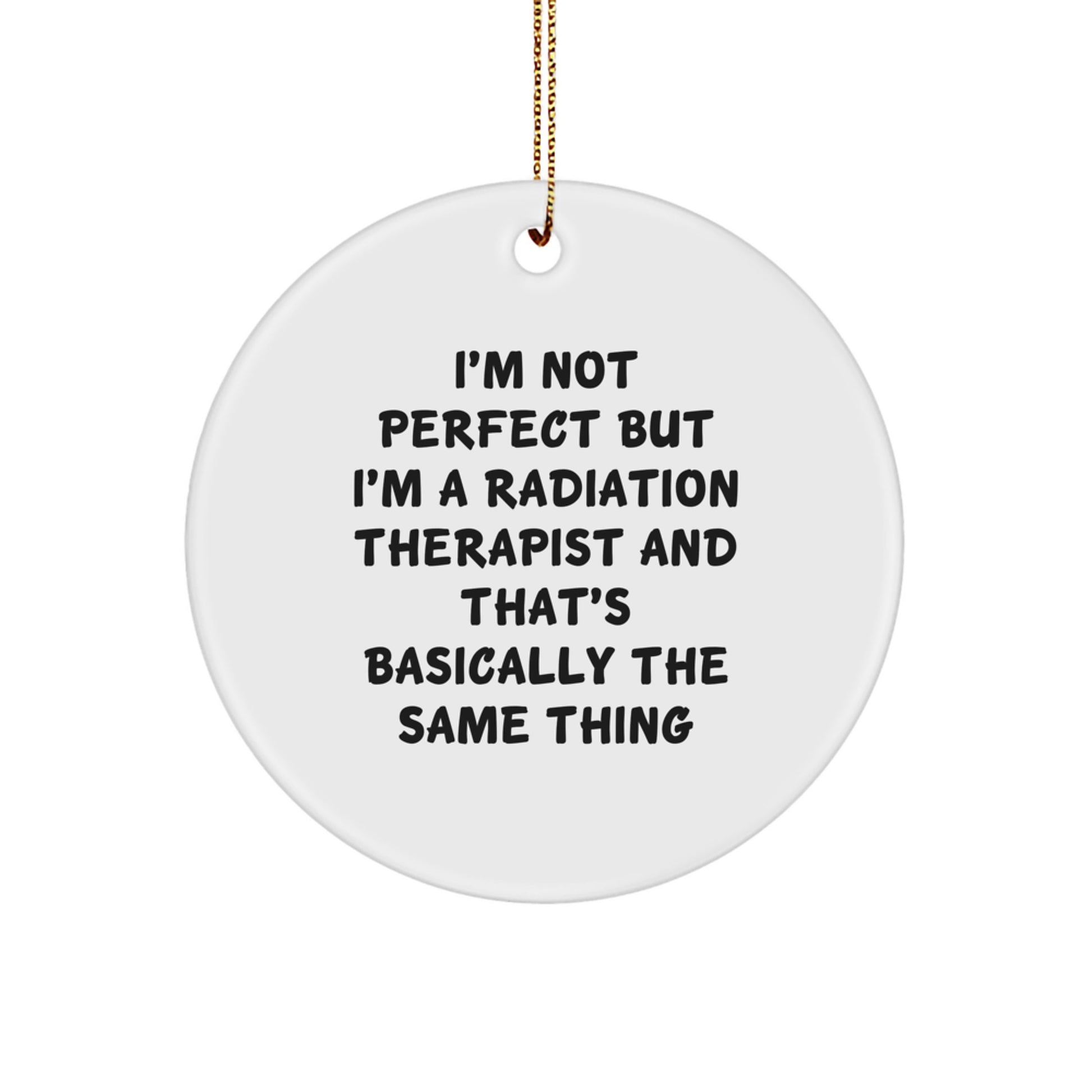 Are you a Radiation Therapist or know someone who is? Look no further for a unique and thoughtful gift! This Circle Ornament features the quote "I'm Not Perfect But I'm A Radiation Therapist And That's Basically The Same Thing", perfect for any Radiation Therapist's Christmas celebration.