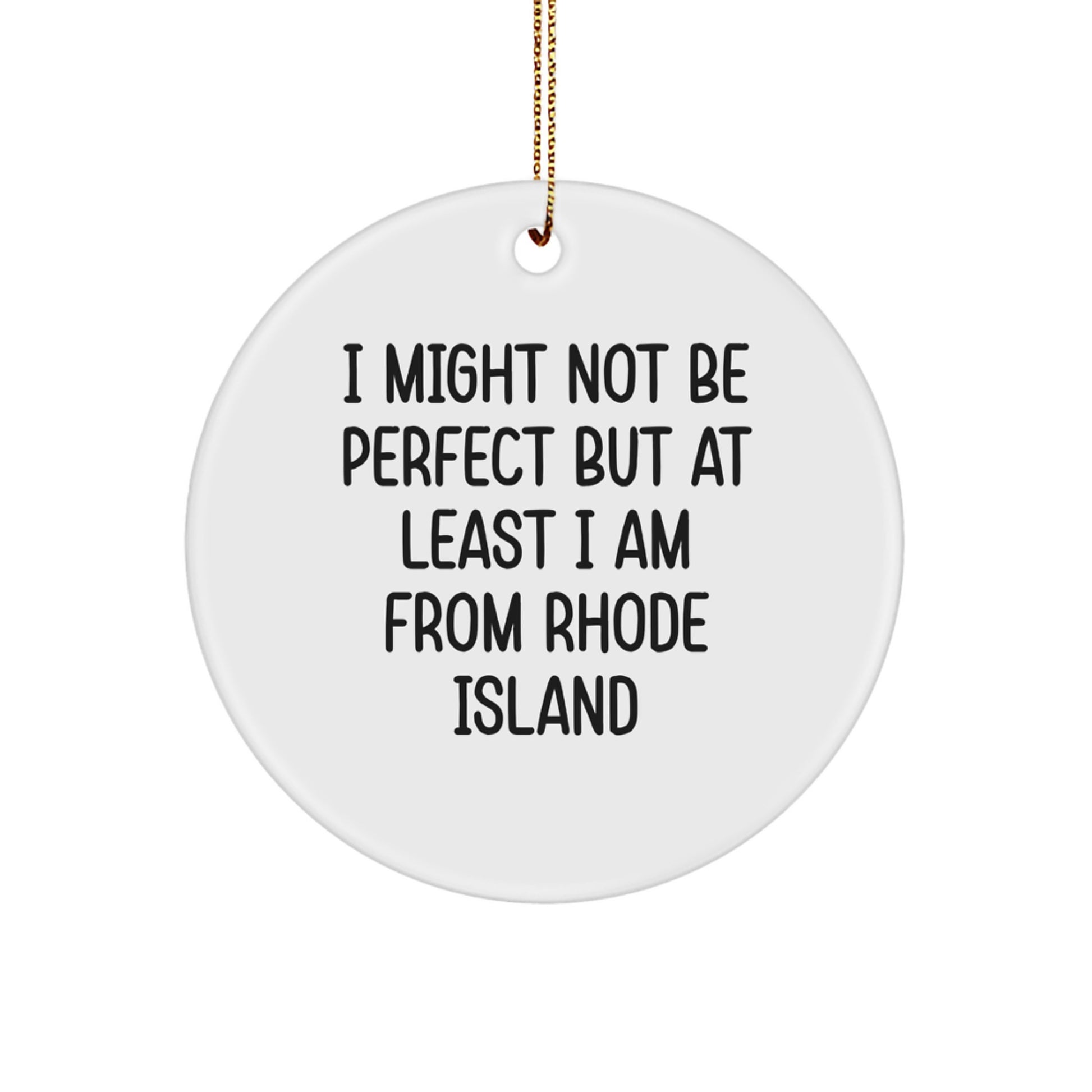 Are you looking for a unique and thoughtful gift for the Rhode Island enthusiast in your life? Look no further! This Circle Ornament features a funny quote that will bring a smile to the face of anyone who receives it. ''I Might Not Be Perfect But At Least I Am From Rhode Island'' is a humorous way to showcase one's pride in being from the Ocean State. The ornament is crafted from sturdy MDF with a high-gloss plastic finish, making it a great choice for households with children or pets. It's lightweight and resistant to breaking, and ships with a festive gold cord for easy hanging. Perfect for decorating your home or giving as a gift to friends and family. Whether you're celebrating Christmas or just want to add a touch of Rhode Island charm to your decor, this Circle Ornament is the perfect choice. So why not show your love for Rhode Island with this fun and unique gift?
