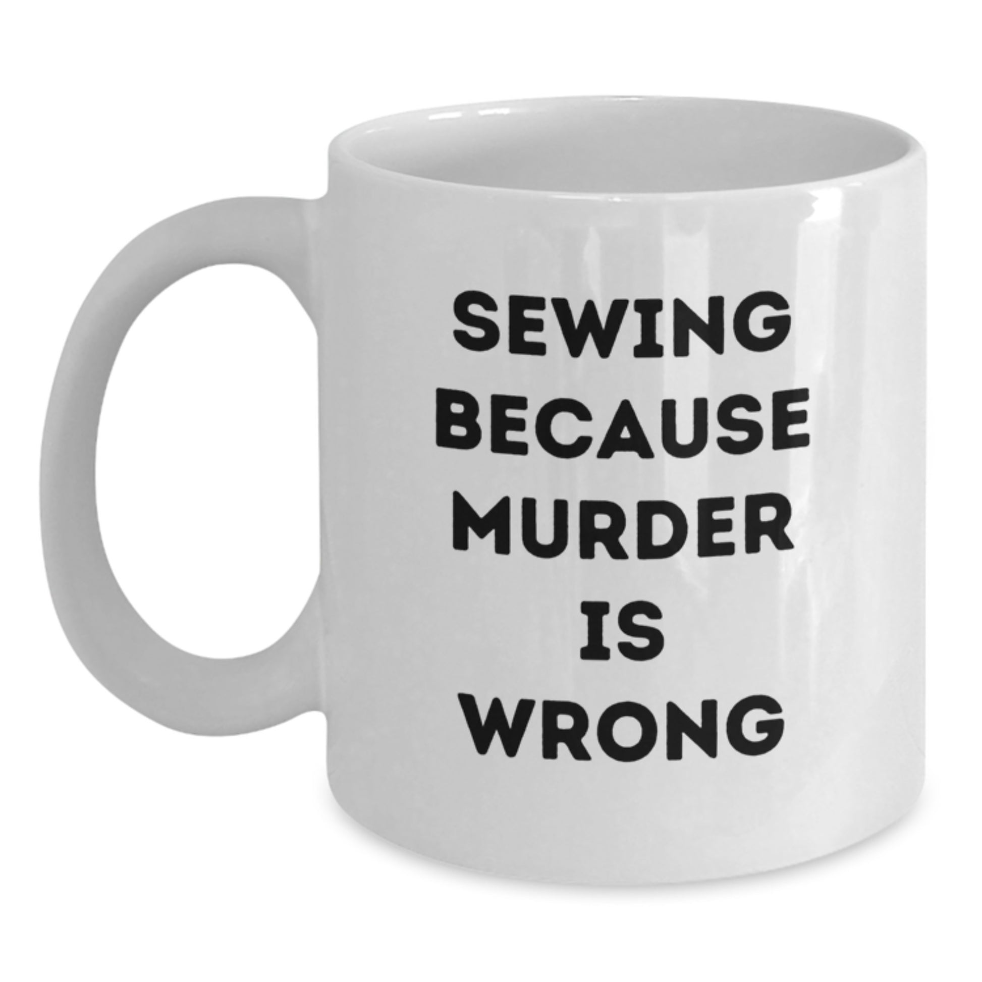 Are you a sewing enthusiast looking for a unique gift for your friends or family? Look no further! This funny white coffee mug is the perfect addition to any sewing room or as a thoughtful gift. The quote on the mug, 'Sewing because murder is wrong', is sure to bring a smile to the face of any sewing lover. The mug is made from ceramic and is microwave and dishwasher safe, making it easy to use and clean. Whether you're giving it as a gift for a birthday or just want to treat yourself, this mug is sure to be a hit. So why not get one for yourself or gift one to a sewing friend today?