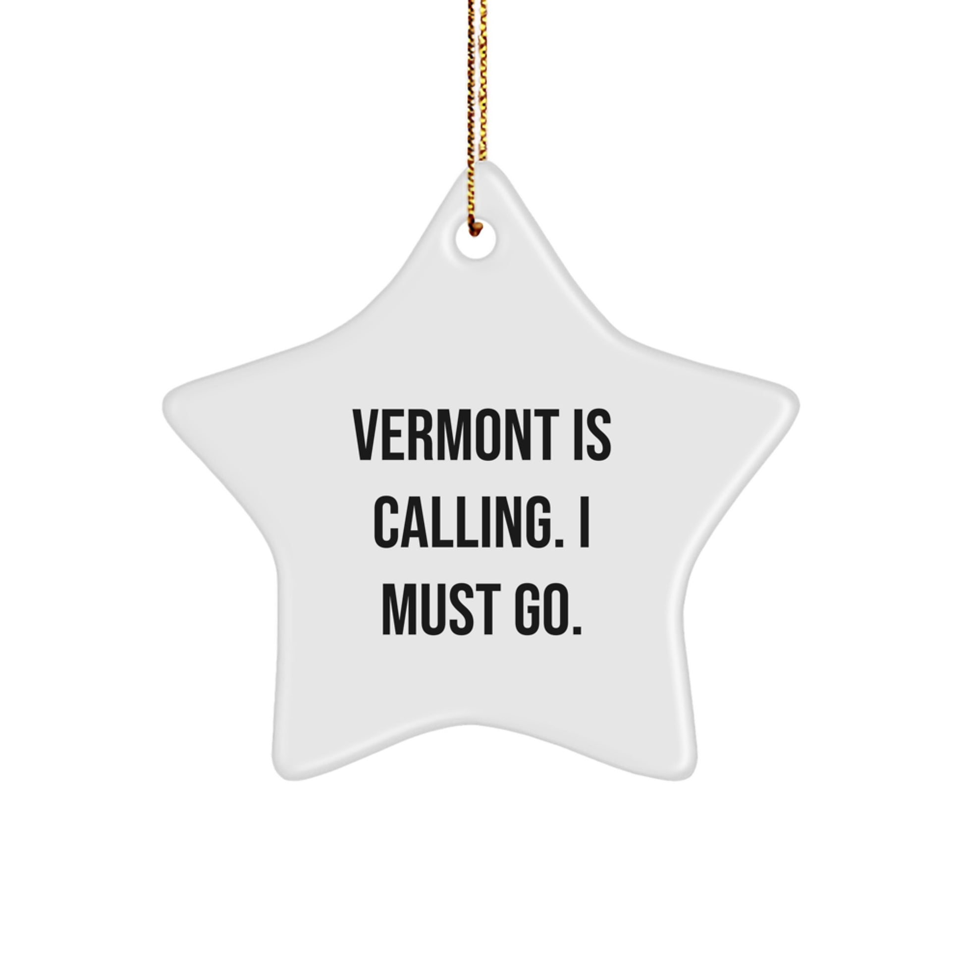 Are you looking for a unique gift for someone who loves Vermont? Look no further! This beautiful star-shaped ornament is a must-have for any Vermont enthusiast. The quote 'Vermont Is Calling. I Must Go.' is a fun and inspirational message that will bring a smile to anyone's face.