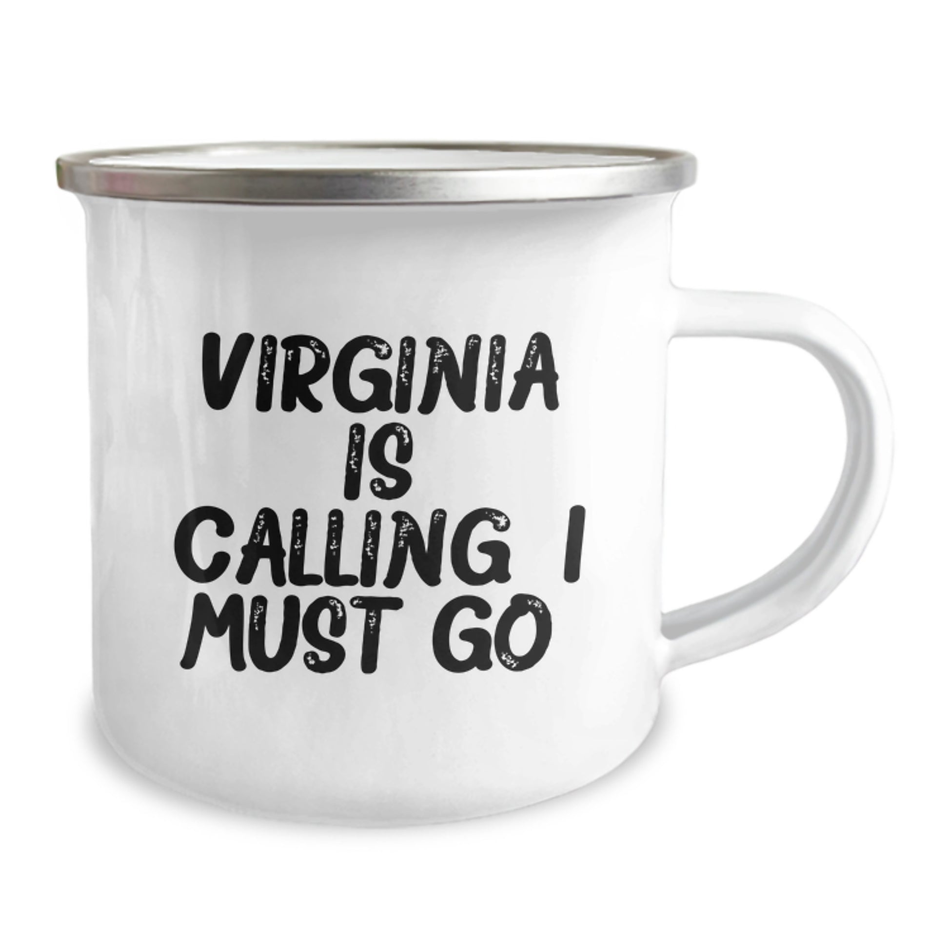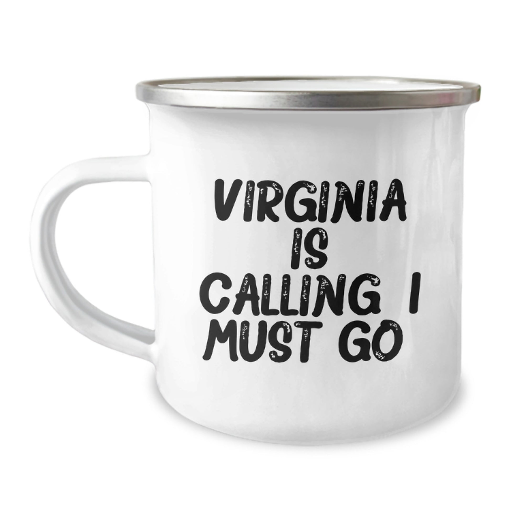 Virginia Calling Gifts for Men and Women, Funny Camping Mug for Graduation, 'Virginia Is Calling. I Must Go.' Printed Design, 12 oz Stainless Steel with Enamel Finish